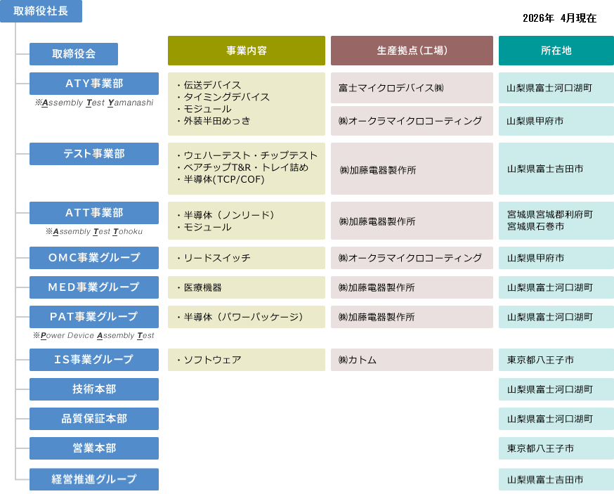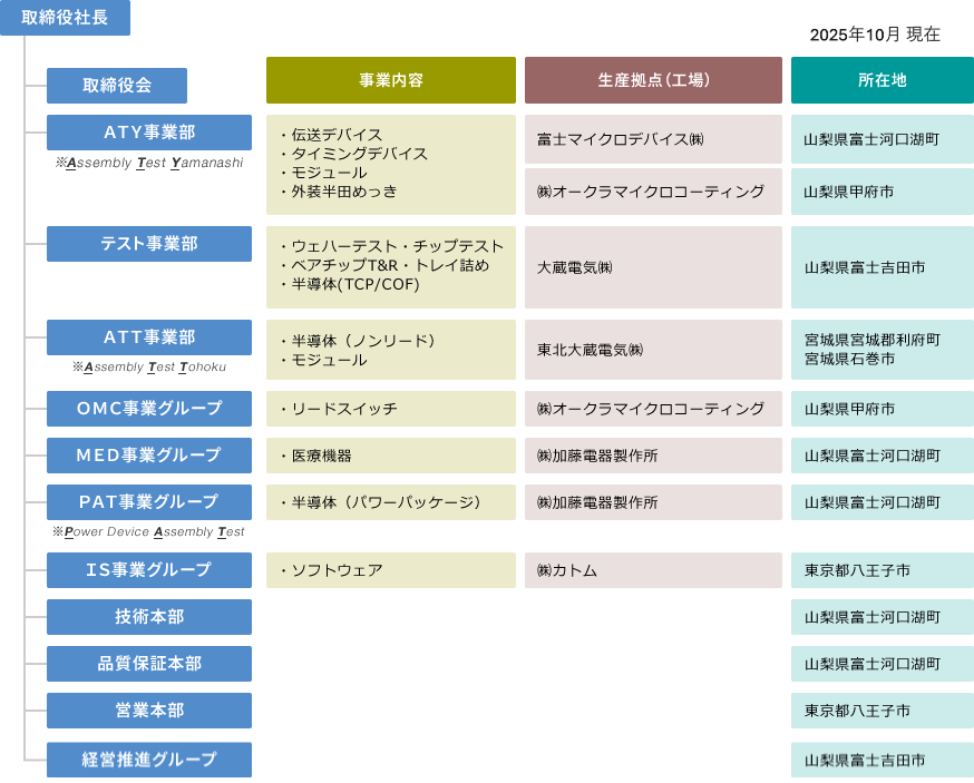 | 関連法人 | 株式会社 カトム 大蔵電気 株式会社 株式会社 オークラマイクロコーティング 東北大蔵電気 株式会社 富士マイクロデバイス 株式会社 |